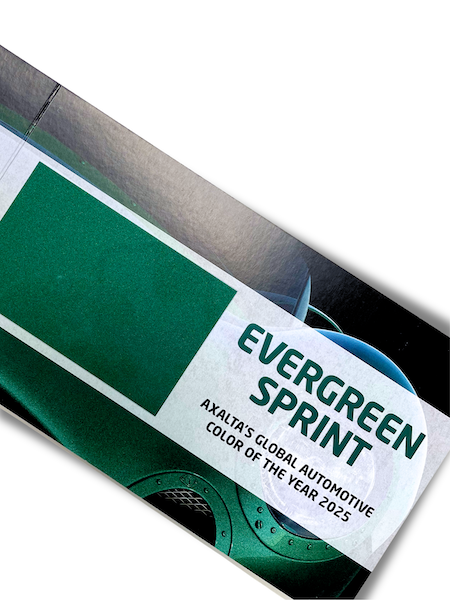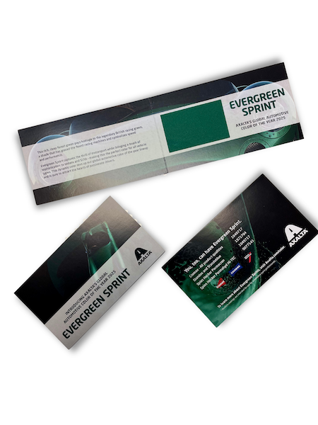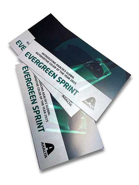 Premier worked with Axalta Coating Systems to design and produce a series of creative sales and marketing materials commemorating Evergreen Sprint, the company’s 2025 Automotive Color of the Year. The color chip brochure and lapel pins were featured as a part of the launch at the 2025 Detroit Auto Show.