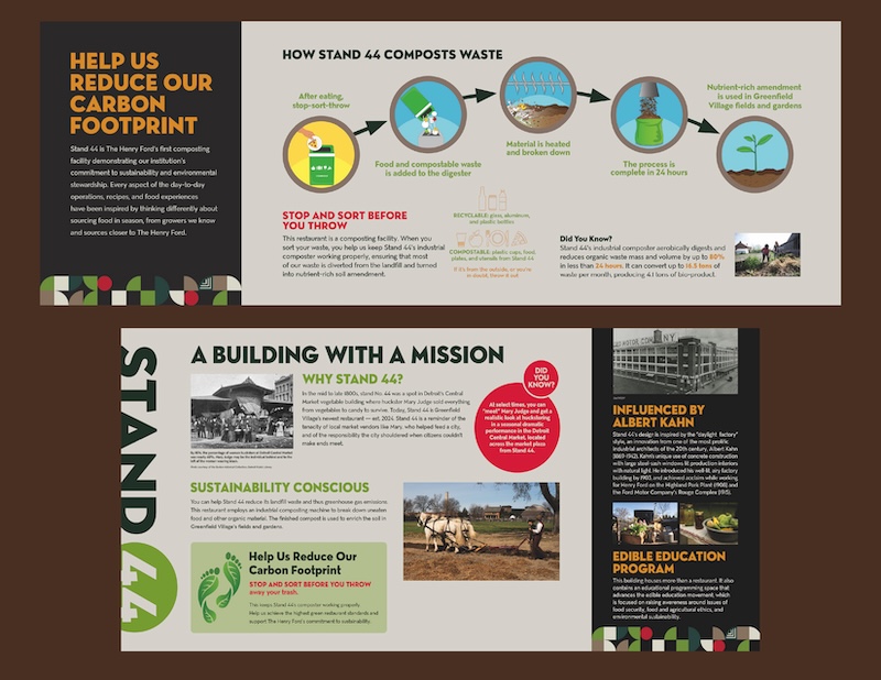 Premier worked with the team at The Henry Ford to develop and refine the restaurant’s branding, including menu design, interior and exterior signage, informational and wayfinding graphics, banners, door signage, and more. Premier managed all aspects, from design and production to output and installation.